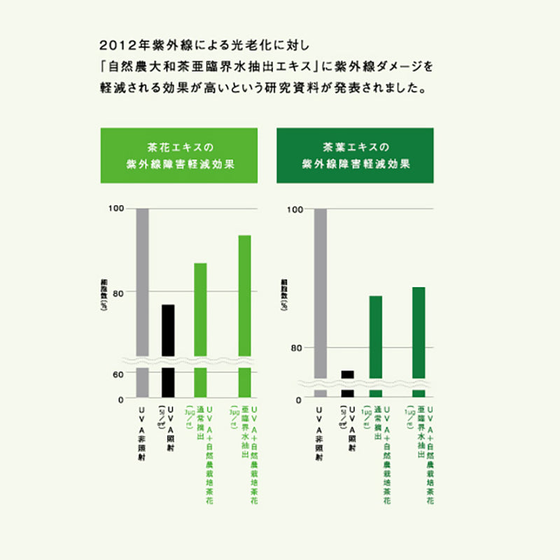 植物に宿る自然のエネルギーの調和を美しい肌づくりに生かすため、大和茶を余すところなく配合しています。茶カテキンが肌のキメを整え、美しいすこやかな肌へと守り抜く「茶葉」、サポニンが肌荒れを防ぎ、ツヤを与えてなめらかな美しい肌を咲かせる「茶花」、オリーブオイルよりもオレイン酸が豊富で潤いとハリを与えふっくらと満ち足りた美しい肌を実らせる「茶実」。長年の技術と経験により、コスメの特性を考慮しながら3つの成分をブレンドしています。